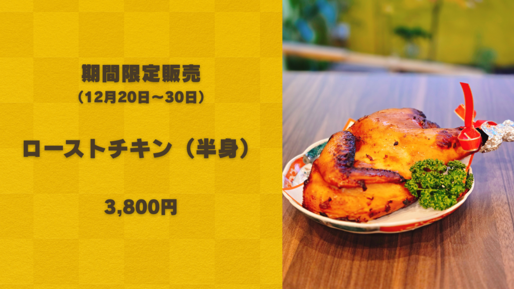 黄金色に輝き、食卓を豪華に彩る極上ローストチキン(半身)を期間限定でご提供します。