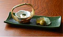 【前菜】伝統の鶏松風、伊達鶏むね肉の生ハム、大久保農園玉蜀黍豆富、春菊の秋浸し 【お造り】旬魚二点盛り 【温菜】季節の茶碗蒸し【鍋物】水たき(骨なし肉)、特選ポン酢、蒸し大蒜、万能葱【お口直し】いちじくの白和えソースがけ 【蓋物】季節の茶碗蒸し 【お食事】お雑炊【甘味】抹茶あいす