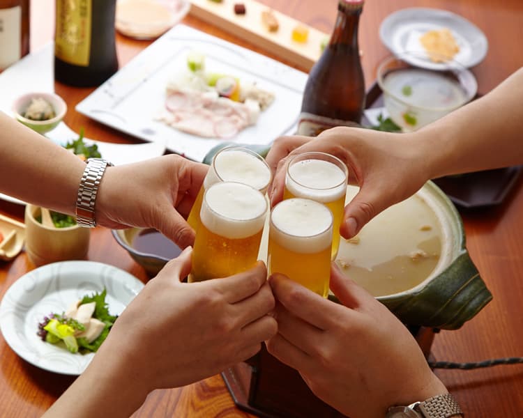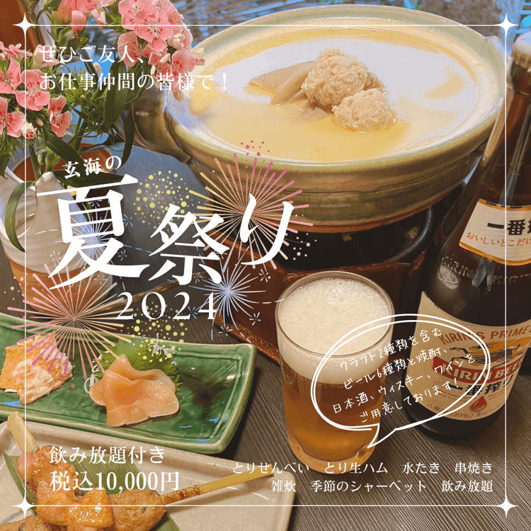 ◆期間限定6月1日~9月30日迄◆「ビール祭コース」 10,000円(税込)玄海の夏祭り『食べる』『飲む』『繋がる』などをテーマに、玄海から夏を盛り上げるお楽しみをご用意いたしました。2名様よりご利用いただける、夏だけのお得な飲み放題付き水たきコースです。開放感のある広間のお席にて、クラフトビールを含むビール5種を中心とした豊富な飲み放題と、お酒がすすむお料理をお楽しみいただけます。飲み放題にはソフトドリンクも含まれておりますので、お得に水たきや串焼きを堪能したい方にもおすすめ。お仕事仲間やご友人でいかがでしょうか。※「ビール祭り」コースは広間席専用のプランでございます。※こちらのコースは電話でのご予約をお願い致します。※個室をご希望の方は「結」「玄海」等のコースをご注文のうえ、飲み放題オプションをご利用ください。【2024年6月1日~お献立】■前菜 鶏煎餅 伊達むね肉の生ハム■焼き物 本日の串焼き■鍋物 水たき(骨なし肉)特選ポン酢 蒸し大蒜 万能葱■お食事 雑炊■甘味 季節のシャーベット◎ご提供期間は6月1日~9月30日となっております。◎仕入れの状況により献立の内容が一部変更になる場合がございます。予めご了承ください。